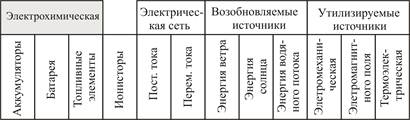 УП состоит из источника (ов) первичного питания и вторичных преобразователей электрической энергии. Источником первичного питания для СИ КПКЭ, как правило, являются электрохимические источники энергии (ЭИЭ) - аккумулятор, батарея, топливный элемент или напряжения электрических сетей, постоянного или переменного тока. В ряде случаев в качестве источника первичной энергии могут выступать локальные источники возобновляемой энергии – ветра, солнца, водяного потока и более экзотические – электромеханическая энергия вибрации, диссипированного электромагнитного поля, термоэлектрических источников; энергия света, передаваемая по оптическому волокну. В качестве редко используемого источника можно рассматривать энергию, запасаемую в электрических ёмкостях большого объёма – ионисторах (суперконденсаторах). На рисунке представлена классификация источников первичной энергии для СИ КПКЭ.