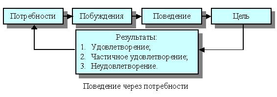 На рис.1 приведена упрощенная модель мотивации поведения через потребности. Для ее более глубокого понимания необходимо конкретизировать понятия потребности, побуждения, поведения и цели.