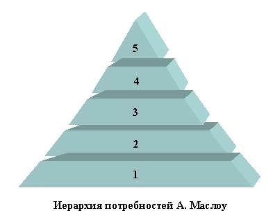 Одной из первых и самых популярных содержательных теорий мотивации была теория Абрахама Маслоу, которая была создана в 40-х годах. А. Маслоу разделил многочисленные потребности человека на пять основных категорий и выявил некую иерархию их ценности. Для простоты и ясности изложения его теории воспользуемся рисунком, известным под названием пирамиды Маслоу.