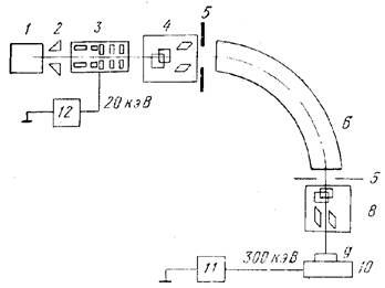 | Рис. 8.1. Рис. 1. Схема установки ионного легирования: 1–ионный источник; 2 – вытягивающий электрод; 3 – фокусирующая система с ускорителем; 4 – система коррекции электронного пучка; 5 – диафрагмы для пропускания сфокусированного пучка; 6 – электромагнитный сепаратор; 8 – система электромагнитного сканирования пучка ионов; 9 – облучаемый образец; 10 – держатель;11 – высоковольтный ускоритель; 12 – предварительный ускоритель |
