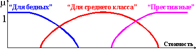 4. Пусть E = { Запорожец, Жигули, Мерседес,....} - множество марок автомобилей, а E' = [0,¥) - универсальное множество " стоимость ", тогда на E' мы можем определить нечеткие множества типа: " для бедных ", " для среднего класса ", " престижные ", с функциями принадлежности типа: