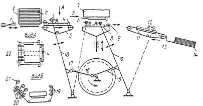 Движение штанг 10 и 18 осуществляется кривошипом, установленным на приводной шестерне 16. Штанги 10 и 18 соединены с кривошипом шатунами 15 и 17. Подъемом и опусканием пневмоприсосов 3 и 12 управляет пазовый кулак.