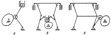 Механизм в является модификацией обоих вариантов. Он представляет собой сдвоенный механизм, части которого расположены параллельно друг другу. При таком построении получается выигрыш в силе по сравнению с первым вариантом, но появляются горизонтальные усилия, уравновешенные во втором варианте.