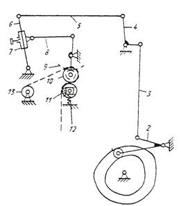 Пазовый кулак 1 при вращении на главном валу качает двуплечий рычаг 2, связанный вертикальной тягой 3 с другим двуплечим рычагом 4. От него качение передается горизонтальным соединительным звеном 5 рычагу 6, имеющему столько параллельных направляющих, сколько рулонов фольги может быть установлено в прессе. На каждой направляющей находится ползун 7, от которого идет шатун 8 к коромыслу с зубчатым сектором 9. Сектор 9 сцеплен с зубчатым колесом, закрепленным на одной оси с верхним валиком 10. Внутри зубчатого колеса находится обгонная муфта, которая при качании сектора 9 передает вращение валику 10 в одном направлении – против часовой стрелки. Нижний валик 11 пружинами 12 прижимается к верхнему валику 10. Ползун 7 может перемещаться вдоль рычага 6 на различные расстояния от центра качания и закрепляться в соответствующем положении, при этом изменяется угол качания сектора 9, а следовательно, и угол поворота валиков 10 и 11. Чтобы валики 10 и 11 дополнительно не поворачивались по инерции, цапфа нижнего валика 11 слегка подтормаживается. Отработанная лента фольги сматывается на катушку, насаживаемую на приводной валик 13. Чтобы не происходило обрыва ленты при увеличении диаметра наматываемого рулона, связь между валиком и катушкой осуществляется регулируемым фрикционным устройством.