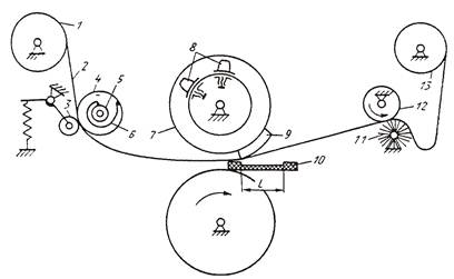Принципиальная схема фольгоподающего аппарата ротационного пресса представлена на рис. 64. В ротационном прессе лента фольги 2 от рулона 1 проходит между периодически поворачивающимися валиками 3 и 4, которые разматывают рулон 1 в каждом цикле на величину 2l, определяемую двойной шириной изображения. Линейная скорость рулона несколько превышает скорость движения переплетной крышки. Валики 3 и 4 начинают вращаться до входа штампа 9 в контакт с крышкой 10, а заканчивают в момент выхода штампа 9 из контакта с крышкой 10. Начало и окончание вращения штампа разматывающих валиков 3 и 4 обеспечивается передвижными упорами 8, устанавливаемыми на формном цилиндре 7. Эти упоры включают и выключают муфту привода валика 5.