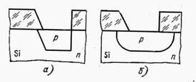 | Рис. 8.25. Фронт р-п перехода при ионном (а) и диффузионном (б) локальном легировании |