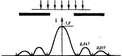 На экране Э будут наблюдаться, так называемые, дифракицонные максимумы и минимумы. Этот факт иллюстрируется графическим распределением интенсивности дифрагированного излучения.