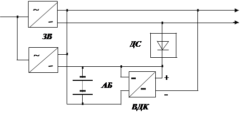 В нормальных условиях электроснабжение АБ и постоянно работающий ВДК, подключенные параллельно выходу ВУ, в питании аппаратуры не принимают участия, т.к. Uвых ВУ несколько выше суммарного напряжения АБ и ВДК. АБ отделена от нагрузки диодной сборкой ДС и содержится в режиме непрерывного подзаряда от зарядного выпрямителя ЗВ. При отсутствии электроснабжения или аварии в ВУ питание аппаратуры осуществляется стабильным суммарным напряжением АБ и ВДК. Недостаток – жесткие требования к динамическим характеристикам ВУ, т.к. АБ не может выполнять функции динамического фильтра.
