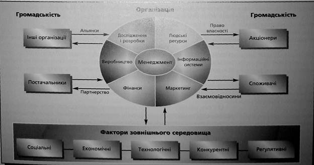 На рис. 1.1 показано основные силы, группы и лица, которые являются внешними по отношению к организации и влияют на ее маркетинговую деятельность. Отдел маркетинга отвечает за установление партнерских отношений с клиентами организации, с ее акционерами, поставщиками и т.п..