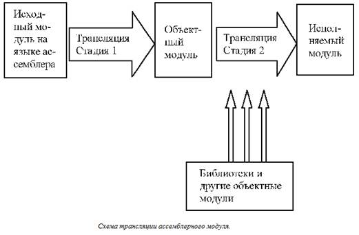 Двум стадиям трансляции соответствуют две основные программы: ассемблер ML.EXE и редактор связей LINK.EXE. Пусть файл с текстом программы на языке ассемблера называется PROG.ASM, тогда две стадии трансляции будут выглядеть следующим образом: