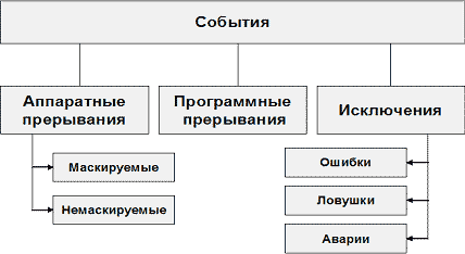 Прерывания и исключения - это события, которые указывают на возникновение в системе или в выполняемой в данный момент задаче определенных условий, требующих вмешательства процессора. Возникновение таких событий вынуждает процессор прервать выполнение текущей задачи и передать управление специальной процедуре либо задаче, называемой обработчиком прерывания или обработчиком исключения. Различные синхронные и асинхронные события в системе можно классифицировать следующим образом: