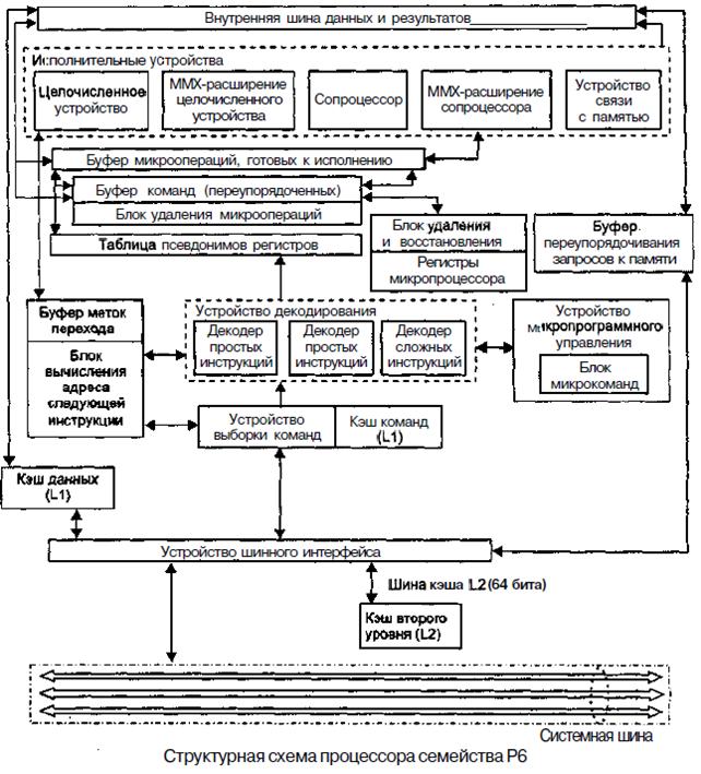 Из схемы видно, что структурно процессор микроархитектуры Р6 состоит из нескольких подсистем.
