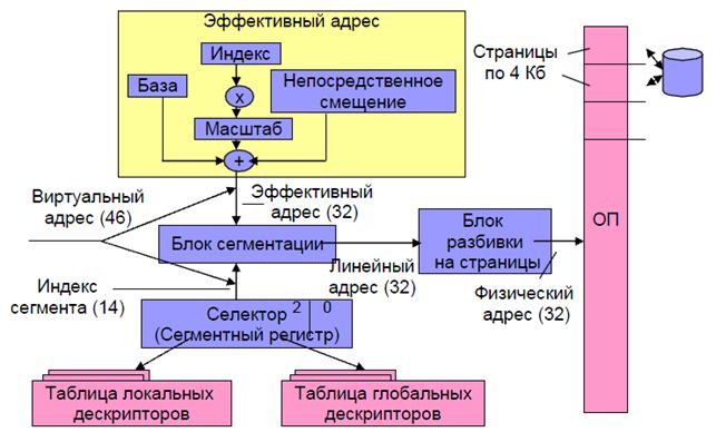 14 бит селектора и 32 бита эффективного или исполнительного адреса, формируемого на основе машинной команды, объединяются в 46-ти разрядный виртуальный адрес.