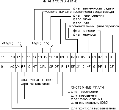 eflags/flags (flags register) — регистр флагов. Разрядность eflags/flags — 32/16 бит. Отдельные биты данного регистра имеют определенное функциональное назначение и называются флагами. Младшая часть этого регистра полностью аналогична регистру flags для i8086. Содержимое регистра eflags.