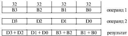 Команда HADDPS осуществляет горизонтальное сложение элементов с одинарной точностью. Первый результат является суммой первого и второго элементов первого (исходного) операнда; второй результат - суммой третьего и четвертого элементов первого операнда; третий результат - суммой первого и второго элементов второго операнда (операнда назначения) и, наконец, четвертый результат - суммой третьего и четвертого элементов второго операнда.
