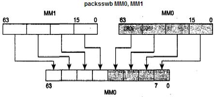 | PACKUSWB | PACK with Unigned Saturation Words to Bytes Упаковка с беззнаковым насыщением знаковых слов приемника (регистра MMX) источника (память или регистр MMX) в байты без знака, расположенные в приемнике (регистре MMX). Отрицательные числа преобразуются в нули. |