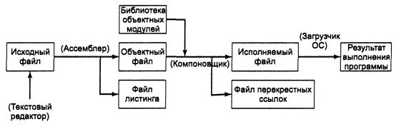 Процесс редактирования исходного ассемблерного файла (т.е. написания программы), его компиляции, компоновки и выполнения схематически показан на рисунке.