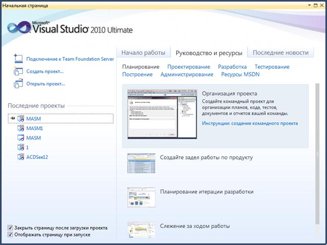 Оба набора в настоящее время не обновляются. В результате они не работают под управлением оперционной системы Windows 7. Рекоменуется испольовать ИСР Visual Studio 2010, в которой при работе с языком программирования Visual C++ можно использовать ассемблерные вставки в код C++. Стартовое окно ИСР: