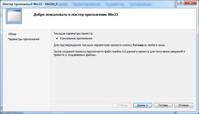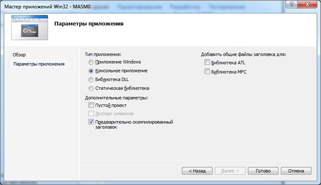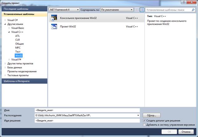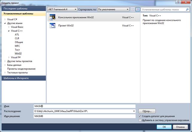 В разделе выбора языка выбираем Visual C++ И шаблон Win32. Из списка принимаем Консольное приложение Win32. Задаем имя проекта MASM1, выбираем место размещения файлов проекта. Устанавливаем флаг Создать каталог для решения.