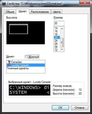 Настройка консоли. Для этого запусить прогамму на выполнение. Щелчком правой кнопки мыши по заголовку консоли вызвать меню, в котором выбрать команду Свойства. Отображается окно настроек, в котором для шрифта выбрать такой же шрифт, что в редакторе – Lucida Console.