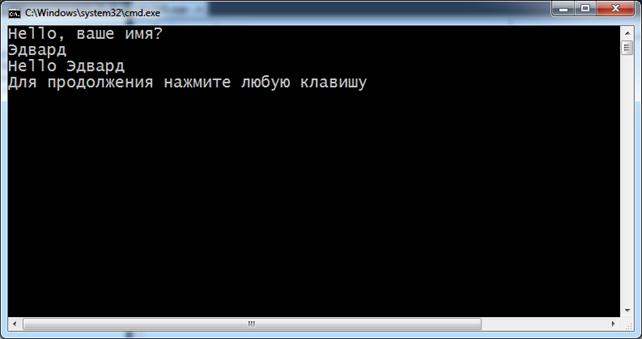 При запуске консольного приложения по умолчанию используется версия шрифта, не поддерживающая кириллицу, используемую в редакторе кода. Например, при выводе фразы «Hello, ваше имя?» в консоли получаем: