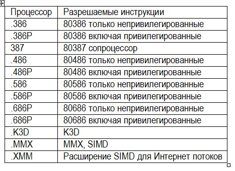Модель памяти. Обязательным параметром директивы MODEL является модель памяти. Этот параметр определяет модель сегментации памяти для программного модуля. В таблице приведены некоторые значения параметра модель памяти директивы MODEL.