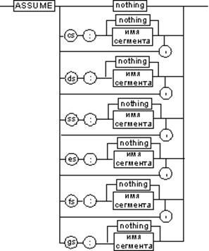 Все сегменты сами по себе равноправны, так как директивы SEGMENT и ENDS не содержат информации о функциональном назначении сегментов. Для того чтобы использовать их как сегменты кода, данных или стека, необходимо предварительно сообщить транслятору об этом, для чего используют специальную директиву ASSUME, имеющую формат, показанный на рисунке. Эта директива сообщает транслятору о том, какой сегмент к какому сегментному регистру привязан. В свою очередь, это позволит транслятору корректно связывать символические имена, определенные в сегментах. Привязка сегментов к сегментным регистрам осуществляется с помощью операндов этой директивы, в которых имя_сегмента должно быть именем сегмента, определенным в исходном тексте программы директивой SEGMENT или ключевым словом nothing. Если в качестве операнда используется только ключевое слово nothing, то предшествующие назначения сегментных регистров аннулируются, причем сразу для всех шести сегментных регистров. Но ключевое слово nothing можно использовать вместо аргумента имя сегмента; в этом случае будет выборочно разрываться связь между сегментом с именем имя сегмента и соответствующим сегментным регистром.