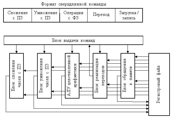 Каждое поле сверхдлинной команды отображается на свой функциональный блок, что позволяет получить максимальную отдачу от аппаратуры блока исполнения команд.