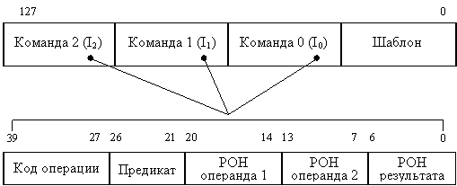 Команды упаковываются (группируются) компилятором в сверхдлинную команду – связку (bundle) длиною в 128 разрядов. Связка содержит три команды и шаблон, в котором указываются зависимости между командами (можно ли с командой I0 запустить параллельно I1, или же I1 должна выполняться только после I0), а также между другими связками (можно ли с командой I2 из связки S0 запустить параллельно команду I3 из связки S1).