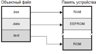 В системе имеется целевая платформа (Устройство), это плата с конкретным процессором. Там имеется целевая память, содержащая разделы: ПЗУ (ROM), перепрограммируемое ПЗУ (EEPROM), ОЗУ (RAM). Этим разделам назначается область адресов в карте распределения целевой памяти. Компоновщик должен перемещать в целевую память разделы объектного кода. Поскольку большинство систем содержат различные типы памяти, то применение разделов может помочь использовать целевую память более эффективно. Все разделы независимо переместимые, любой раздел можно разместить в любом блоке целевой памяти. Если у вас нет целевой платформы, то отладчик имитирует ее.