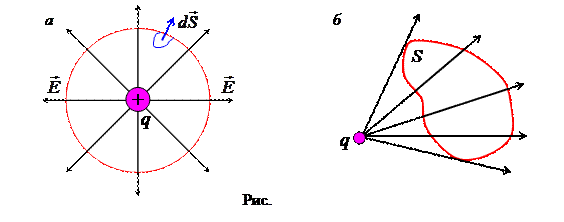 а) Рассмотрим точечный заряд. Пусть для начала имеем поверхность, окружающую заряд, в виде сферы с центром в точке нахождения заряда (рис..