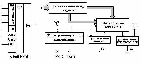 2.1 Условно-графическое обозначение и структурная схема ОЗУ динамического типа КР565РУ5Г емкостью в 65536*1 бит приведены на рисунке 5.