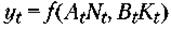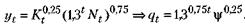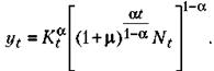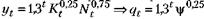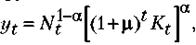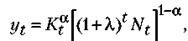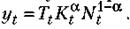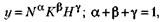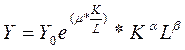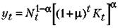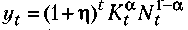 В экономике, имеющей постоянный темп прироста населения и предложения труда (n), технология производства отображается производственной функцией Кобба—Дугласа: