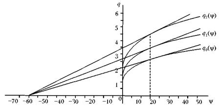 смещается и деформируется так, что все касательные в точках, соответствующих заданному значению qo, пересекают ось ординат в одной и той же точке.