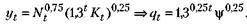 . Произведения в круглых скобках представляют объемы труда и капитала, измеренные не в реальных физических единицах, а в условных единицах их эффективности. Они показывают, сколько реальных единиц каждого фактора пришлось бы использовать при фиксированной (базовой) его производительности для выпуска г/( единиц продукции при отсутствии технического прогресса.