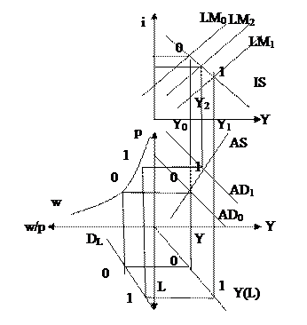 Кейнсианская модель монетарной политики (рисунок): (стабилизация денежной системы, недопущение роста цен в неоклассической теории). Влияние на реальные процессы в Кейнс. теории: при увеличении ден. массы(LM0→LM1 смещение вправо вниз) совокупный спрос тоже растет(AD0→AD1 смещение вправо вверх) – эффект имущества.