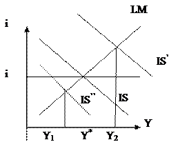 А) спрос на деньги стабилен, а спрос на товары колеблется. 1) Если в этой ситуации выбрать политику стабилизации денег, кривая LM на одном уровне, это значит колеблемость Y: от Y1 до Y2. 2) Если выбрать политику стабилизации ставки процента LM смещается (от LM” до LM’), разброс колебаний больше, экономика менее устойчива, колеблемость Y: от Y3 до Y4. Отсюда видно надо проводить стабилизацию денежной массы.