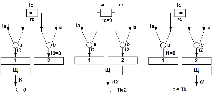 Затем пластина 1 постепенно сбегает со щетки, а пластина 2 - набегает. В результате секция оказывается замкнутой через щетку и ток в ней постепенно уменьшается. Через время 0.5 * Tk щетка будет находится посредине пластин 1 и 2.