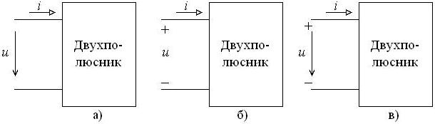Напряжение, как отношение двух скалярных величин, также является скалярной величиной. Однако электрическому напряжению приписывают знак, который отмечают либо стрелкой, либо символами "+" и "–" (рис. 1.3 – двухполюсником называют электрическую цепь, рассматриваемую относительно двух её выводов). Знак "+" подразумевает, что электрический потенциал данной точки проводника считают бóльшим, чем у точки, обозначенной символом "–".