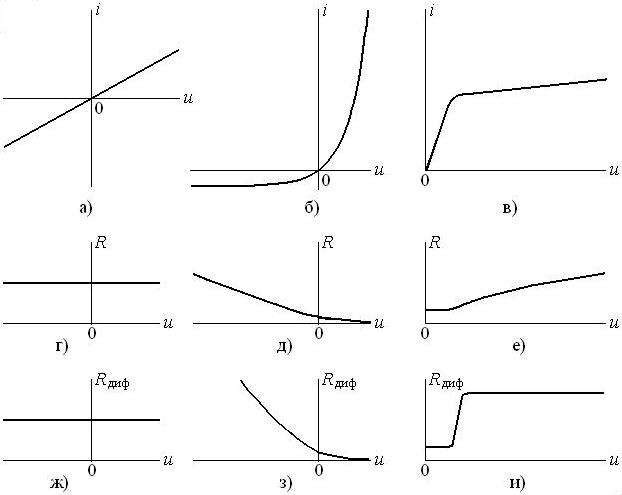 Для линейных элементов дифференциальное сопротивление равно статическому (рис. 2.2 ж), для нелинейных оно нелинейно и отличается от статического (рис. 2.2 з и 2.2 и).
