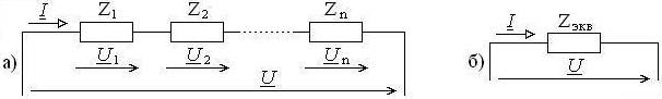 Рис. 7.1. Последовательное соединение элементов (а – исходная схема, б – эквивалентная схема)