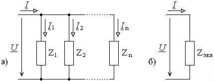 Рис. 7.2. Параллельное соединение элементов (а – исходная схема, б - эквивалентная схема)
