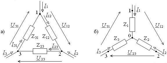 Рис. 7.3. Соединение ветвей треугольником (а) и звездой (б)