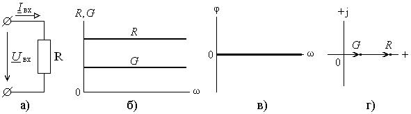 от частоты не зависят и поэтому их амплитудно-частотные (рис. 14.2, б) и фазочастотные (рис. 14.2, в) характеристики представляют собой постоянные функции, а годографы – точки на действительной оси комплексной плоскости (рис. 14.2, г).