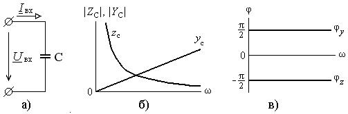 Рис. 14.3. Ёмкость (а), амплитудно-частотные (б) и фазочастотные (в) характеристики входного сопротивления и проводимости ёмкости