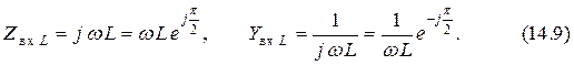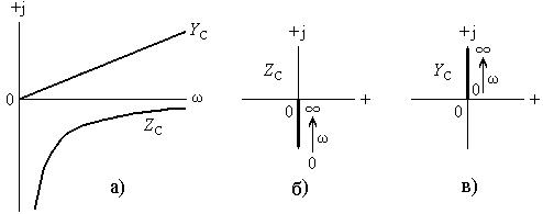 Годографы сопротивления (рис. 14.4, б) и проводимости (рис. 14.4, в) ёмкости представляют собой вертикальные линии, совпадающие с отрицательной и положительной полуосями оси ординат.