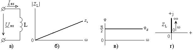 Рис. 14.5. Индуктивность (а), амплитудно-частотная (б) и фазочастотная (в) характеристики и годограф входного сопротивления (г) индуктивности