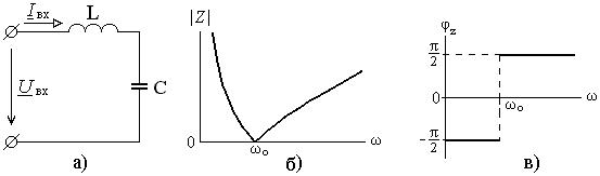 -цепь (а), амплитудно-частотная (б) и фазочастотная (в) характеристики входного сопротивления цепи