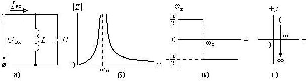-цепь (а), амплитудно-частотная (б) и фазочастотная (в) характеристики и годограф (б) входного сопротивления параллельной
