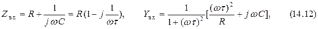 3. Последовательное соединение сопротивления и ёмкости (рис. 14.9, а) характеризуется входным сопротивлением или проводимостью: